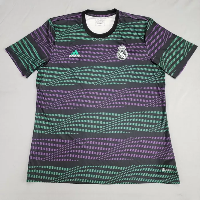 Show your support for Los Blancos with this adidas Real Madrid pre-match training shirt. Designed for both performance on the pitch and casual wear in the stands, this top features a striking multicolor striped pattern blending black, green, and purple tones. The iconic Real Madrid crest sits proudly on the chest, paired with the classic adidas logo to complete the authentic athletic look. Engineered with signature adidas AEROREADY technology, this short-sleeve shirt is crafted from lightweight, breathable polyester designed to manage moisture and keep you dry during intense matches or active training sessions. The tailored slim fit provides a streamlined, modern silhouette that moves with you, while the comfortable crew neckline ensures unrestricted mobility. Whether you are gearing up for a local pickup game, hitting the gym, or representing your favorite international club around town, this jersey delivers reliable comfort and bold style. Machine wash cold with like colors and tumble dry on low to maintain the vibrant graphics and performance fabric.