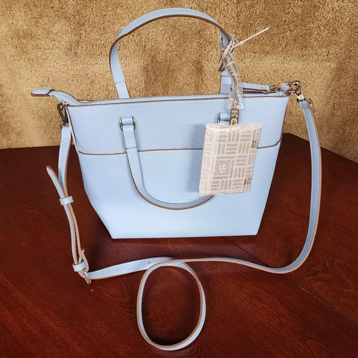 | Keywords | Anne Klein Satchel, Light Blue Handbag, Saffiano Faux Leather, Crossbody Purse, Top Handle Bag, Lion Logo Charm, Structured Tote, Pastel Blue, Convertible Strap, Vegan Leather, Summer Bag, Office Handbag |