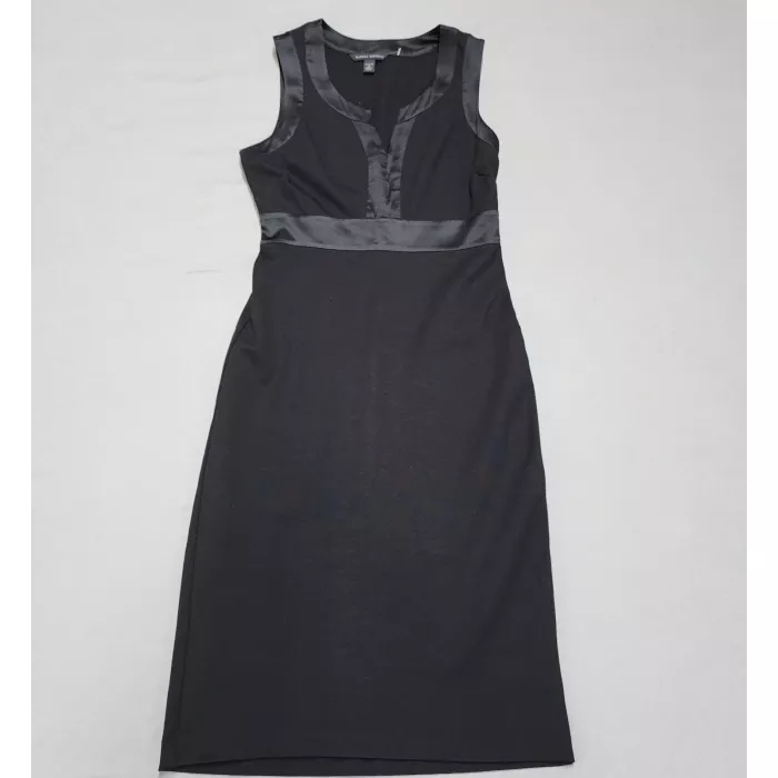 Clean lines and a tailored fit define this classic black sheath dress from Banana Republic. Designed to offer a sophisticated silhouette, this piece features an elegant V-neckline and a sleeveless cut that transitions seamlessly from professional settings to evening events. The solid black color provides a highly adaptable foundation for any styling preference, allowing for endless accessory combinations. A standout element of this design is the subtle satin trim detailing around the neckline and waist. This thoughtful addition brings a touch of refined contrast to the knit fabric, highlighting the natural waistline. The material incorporates built-in stretch for ease of movement, ensuring a comfortable and form-flattering fit throughout the day. A concealed zipper closure provides a smooth, seamless finish along the back profile. Falling to a chic midi length, this dress pairs beautifully with classic pumps, flats, or strappy heels depending on the occasion. Layer it under a tailored blazer or cardigan for corporate environments, or wear it on its own with statement jewelry for dinner engagements and formal gatherings. The timeless design ensures it remains a reliable choice for years to come.