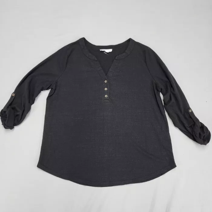 Jane + Delancey Womens L Black Henley Top Roll Tab 3/4 Sleeve Stretch Shirt
