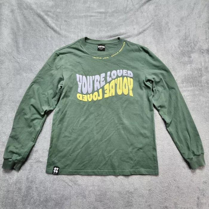 Elevate your casual wardrobe with this uplifting long sleeve T-shirt from OTTO By Kinis. Rendered in a calming sage green hue, this top combines comfort with positive affirmations designed to inspire self-love and gratitude. The soft jersey fabric ensures a comfortable fit for all-day wear, making it an excellent choice for lounging, running errands, or casual outings. The design features unique graphic details placed thoughtfully throughout the garment. The phrase "YOU'RE LOVED" is printed on the chest, while the neckline bears the reminder to "INHALE LOVE EXHALE GRATITUDE." Additionally, the back hem features the empowering message "WORTHY OF LOVE AND HAPPINESS." Finished with a classic crew neck, ribbed cuffs, and a woven logo label at the hem, this tee offers both style and sentiment.